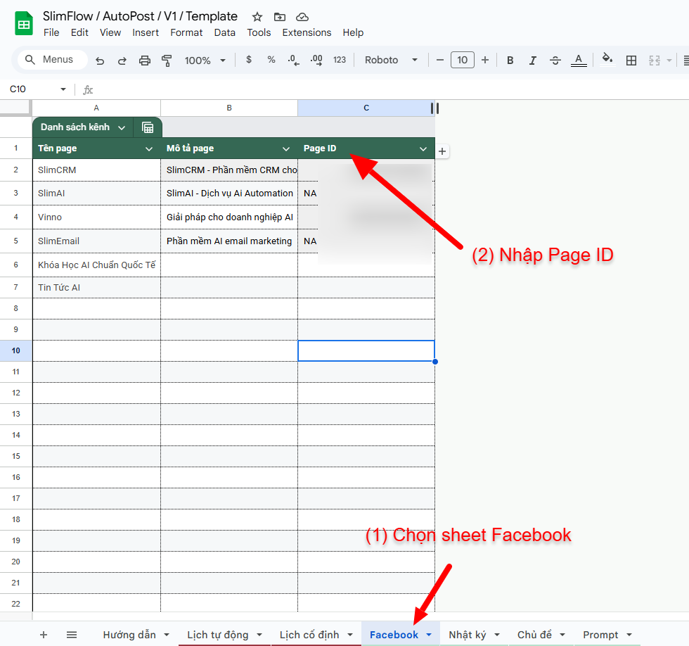 1.1 – Nhập thông tin fanpage trong Sheet “Facebook”