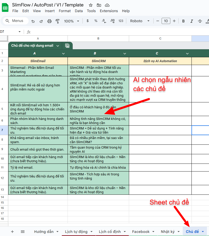 Khi bật chế độ “AI tự sáng tạo”, hệ thống sẽ chọn ngẫu nhiên 1 chủ đề trong sheet này để tạo bài mới.
