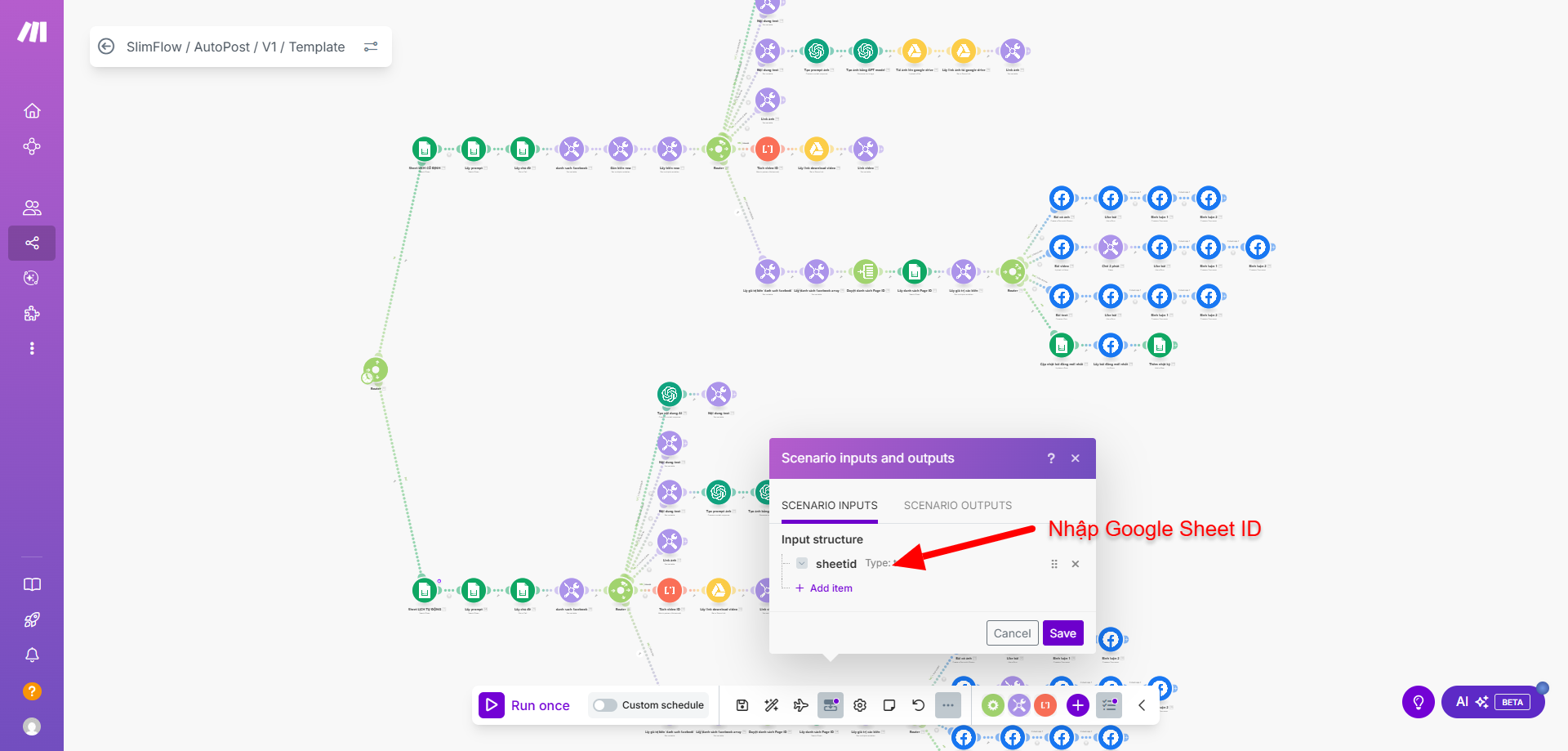 | 5 | Vào Make, nhập sheetid, bấm Run | Kiểm tra flow |