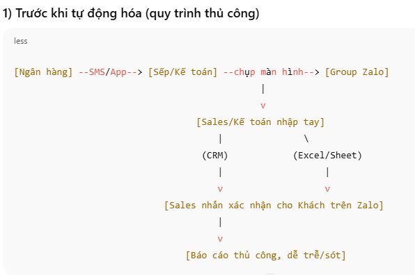 | Nhận tin SMS rồi nhập tay vào CRM hoặc Excel | Tự động đồng bộ giao dịch từ ngân hàng |