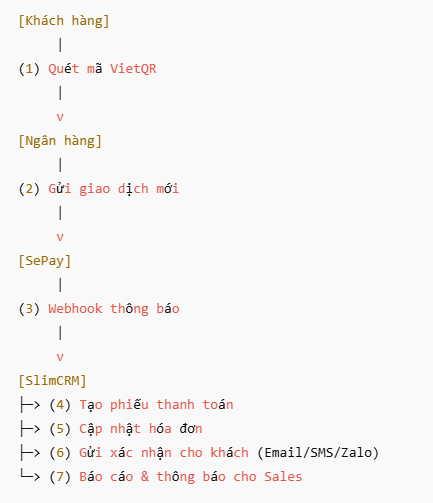 | 4️⃣ | SlimCRM nhận dữ liệu, tự động tạo phiếu thanh toán và gắn vào hóa đơn | SlimCRM |