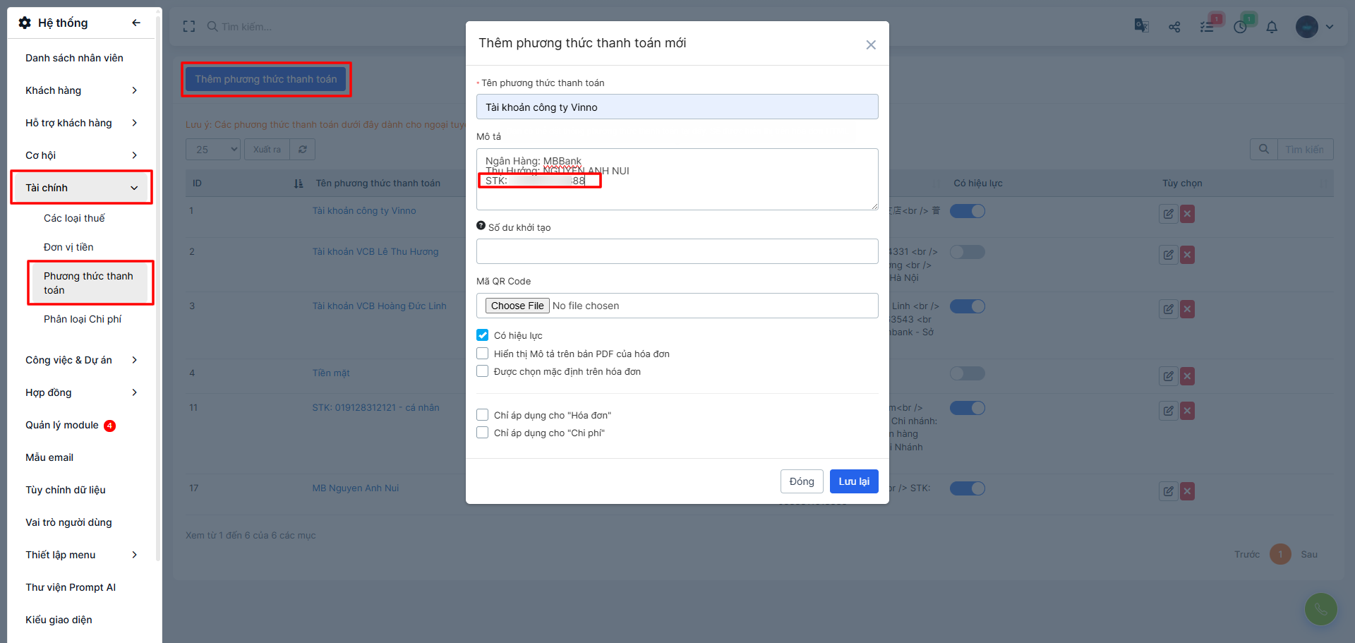 Hệ thống > Tài chính > Phương thức thanh toán > Thêm mới.