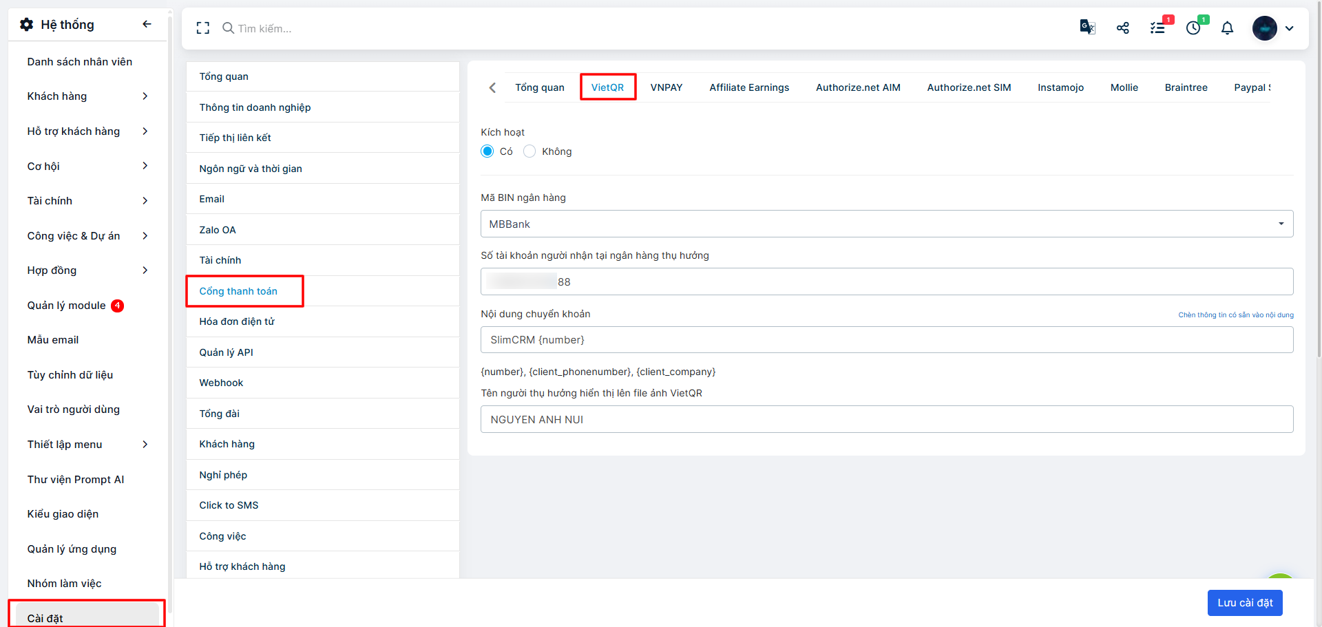Hệ thống > Cài đặt > Cổng thanh toán > VietQR.