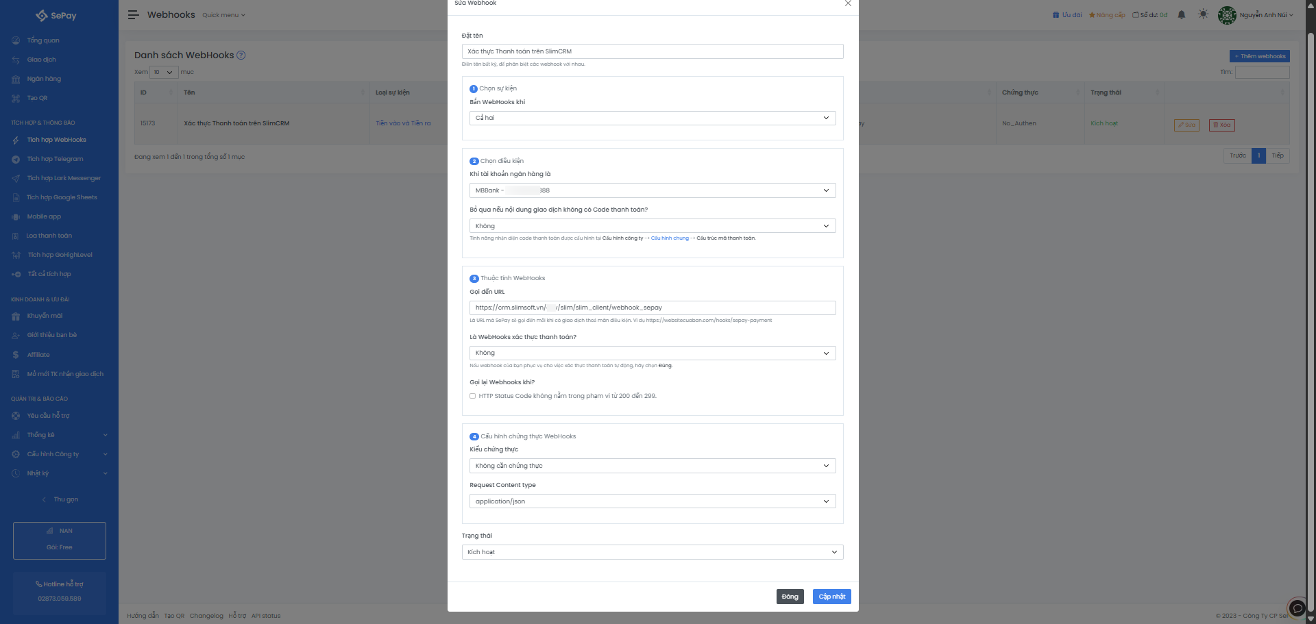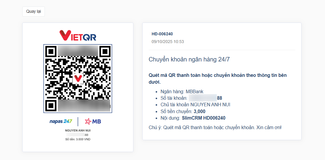 Khi kết hợp với SlimCRM, mỗi lần có chuyển khoản mới, hệ thống sẽ tự động: