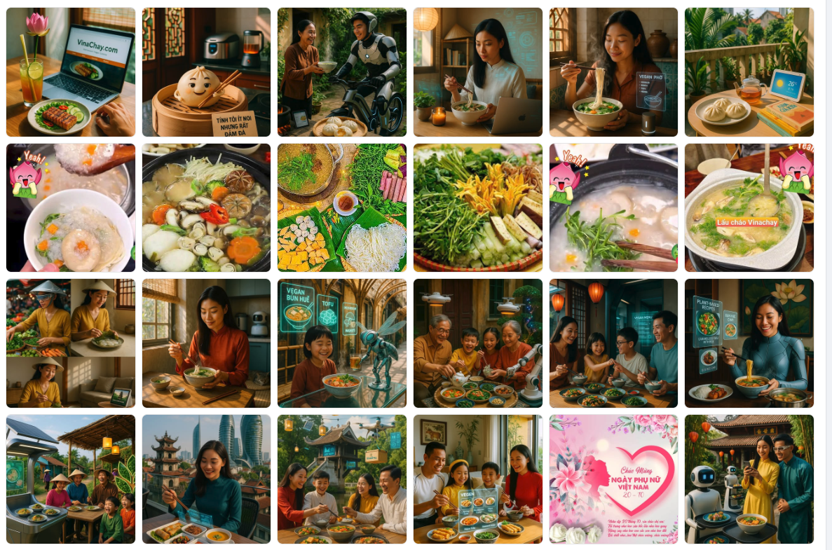 Ví dụ: caption nói về “Lẩu Thái chay cay ấm ngày mưa” → ảnh AI sinh ra đúng phong cách ấm, ánh sáng vàng, hơi nước nhẹ – tạo cảm giác thật và gần gũi.