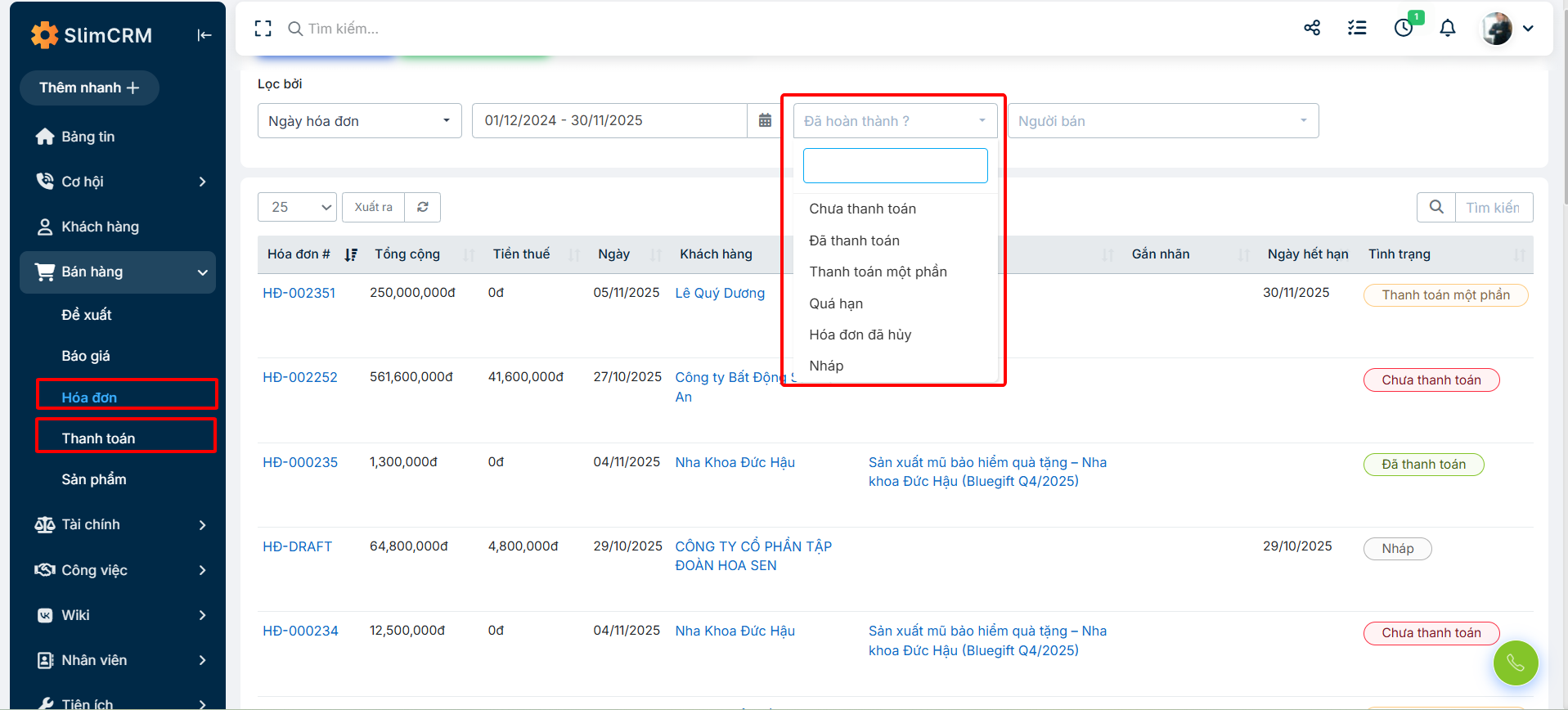 [SlimCRM]: Kế toán theo dõi công nợ, trạng thái thanh toán & xuất hóa đơn trực tiếp từ CRM